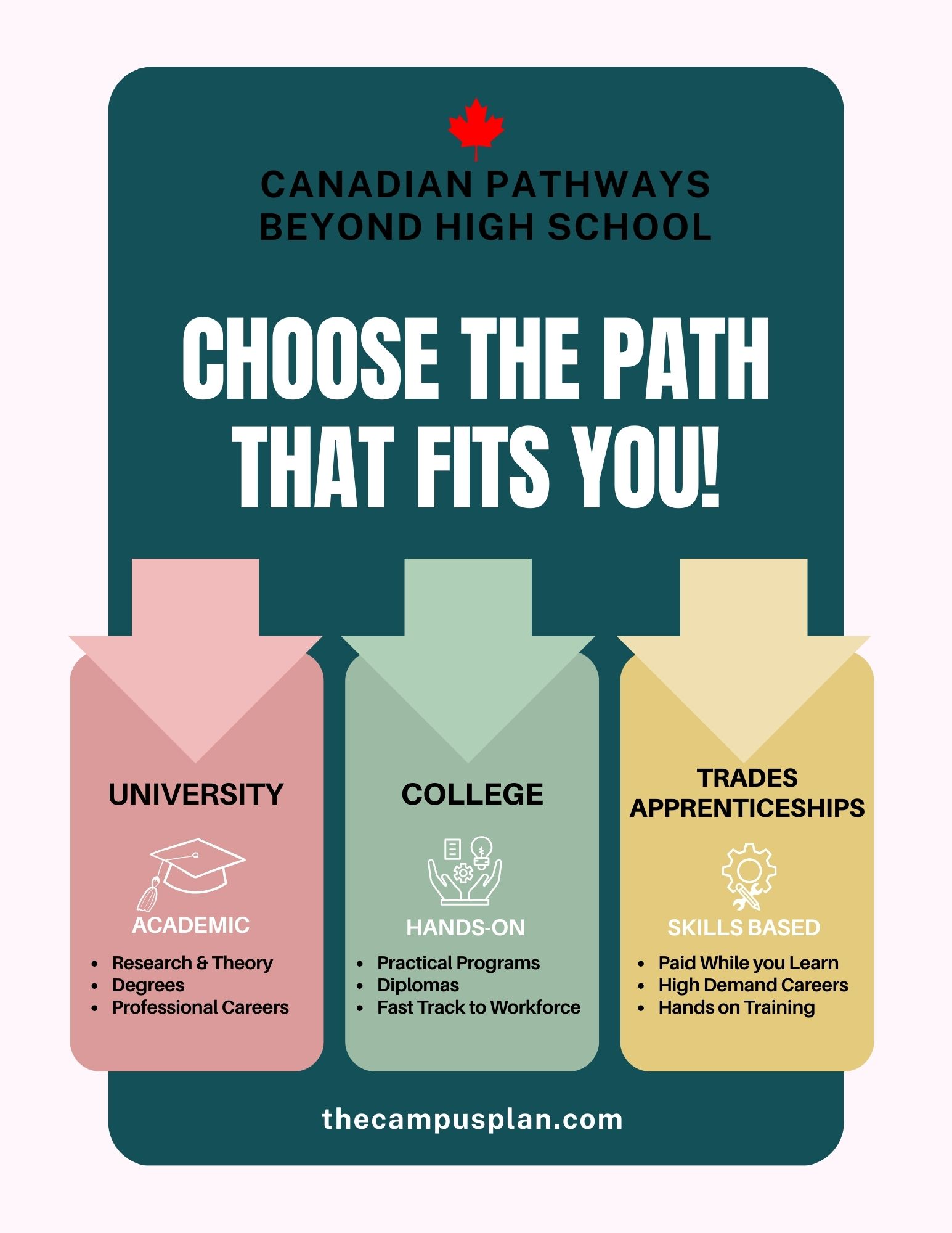 In Canada students typically choose from 3 main post-secondary pathways after high school: University, College, and Trades/Apprenticeships. While these are not the only options available, they represent the most common and structured routes students take toward further education and career preparation.