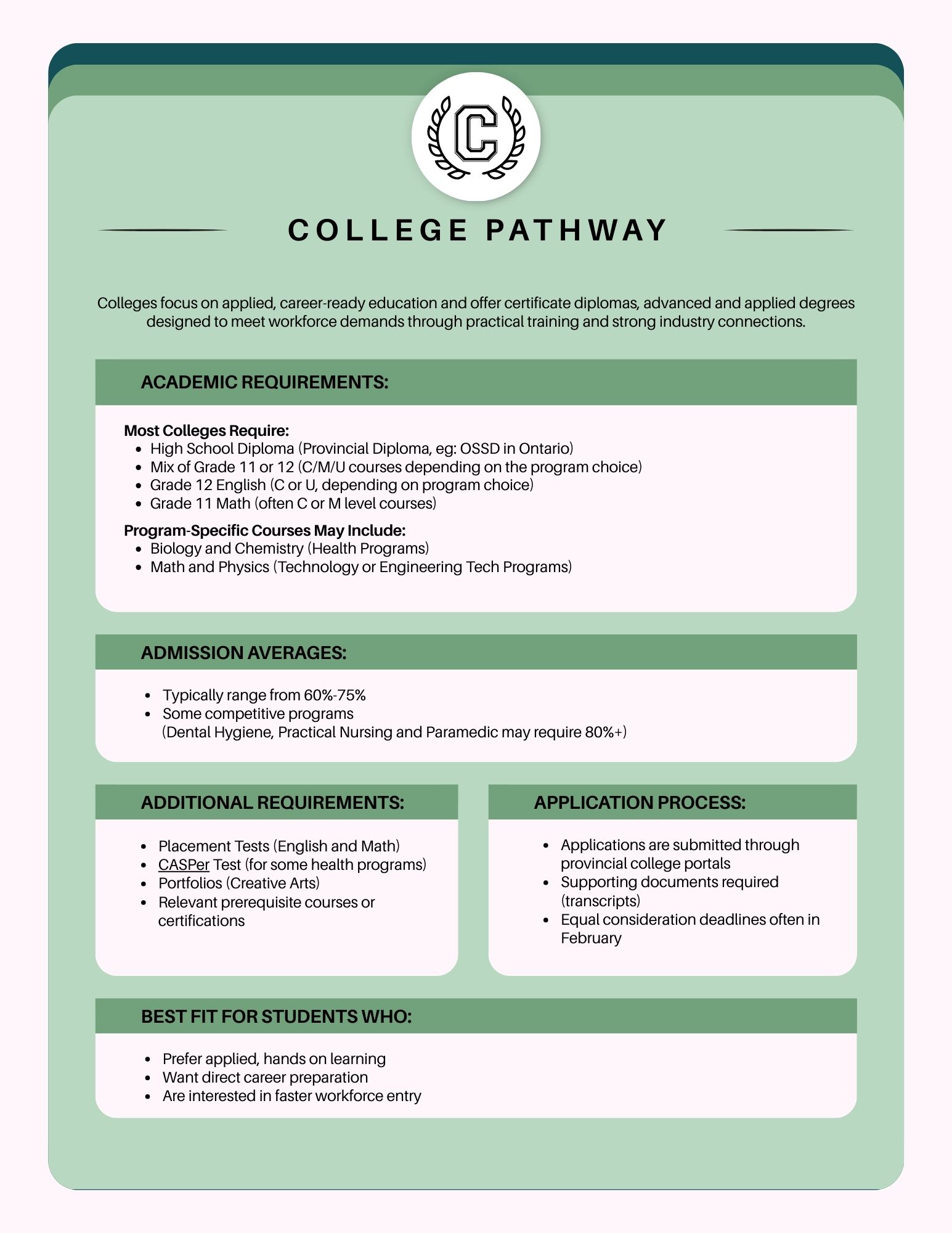 Our visual guides below break down academic requirements, admission averages, application processes, and who each pathway is best suited for, making it easier for students to compare all options at a glance.